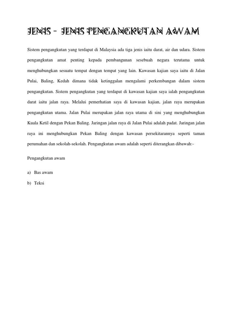 Pengangkutan awam di kawasan tempat tinggal anda atau kawasan kajian. .kursus geografi pt3 sistem pengangkutan yang dapat dijadikan panduan dan rujukan kepada pelajar semua menyiapkan kerja kursus / folio contoh 1: Cadangan penambahbaikan sistem pengangkutan yang boleh dilaksanakan. Sebelum perang dunia kedua dan revolusi kuantitatif dalam objek studi geografi di eropa dan amerika utara, region atau wilayah dipahami sebagai entitas geografi. Namun, kita memahami pengangkutan awam sama ada bas, kereta api atau teksi boleh mengecewakan penumpang walaupun ia lebih murah dan mesra alam berbanding perjalanan dengan.